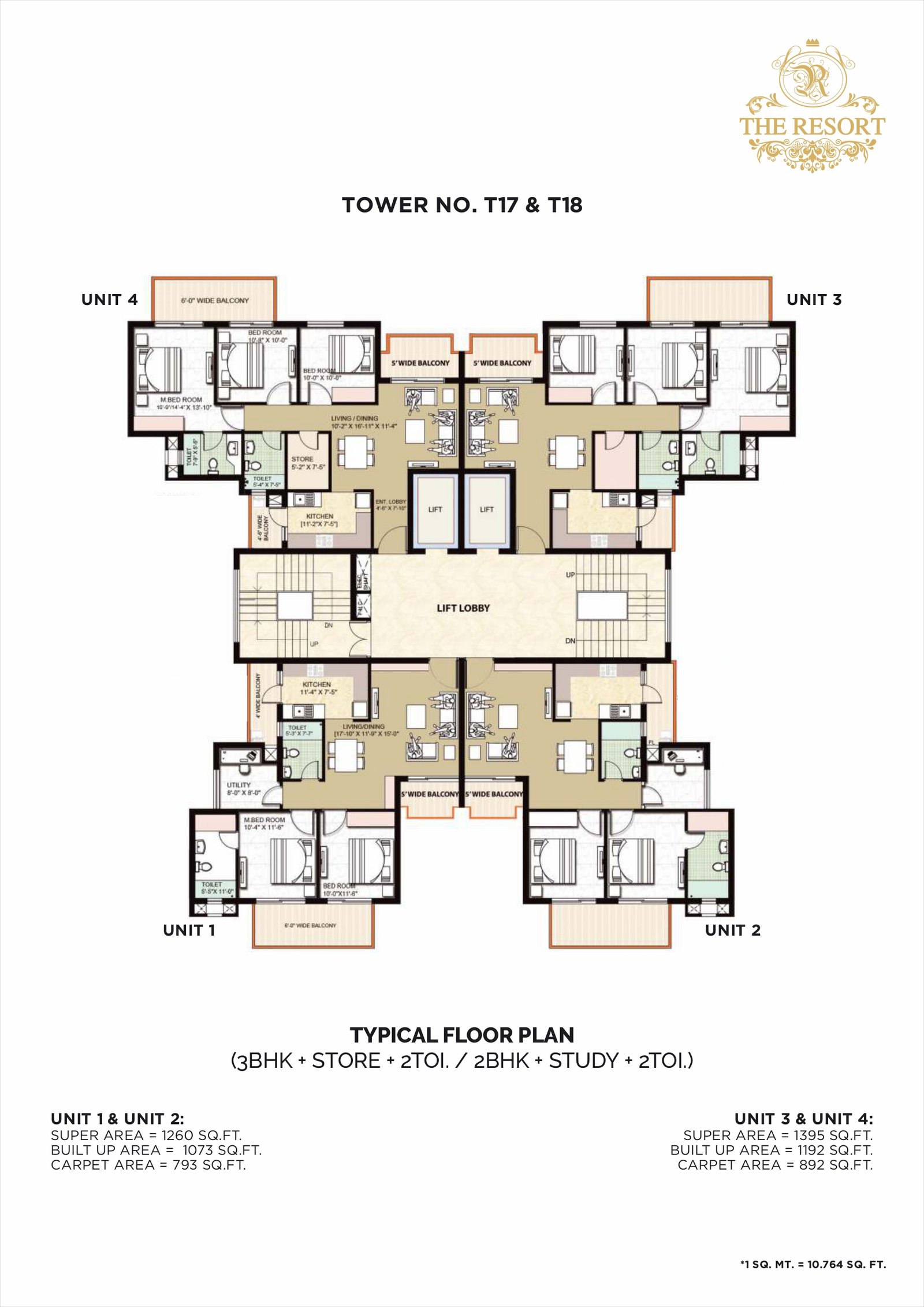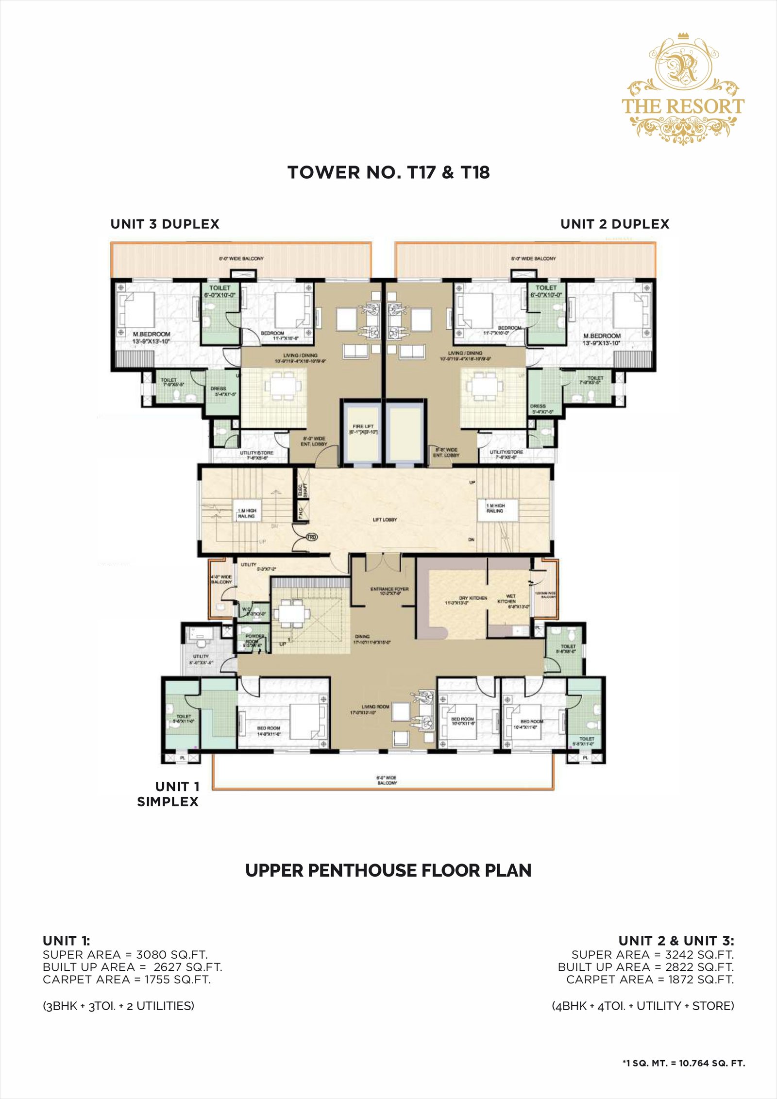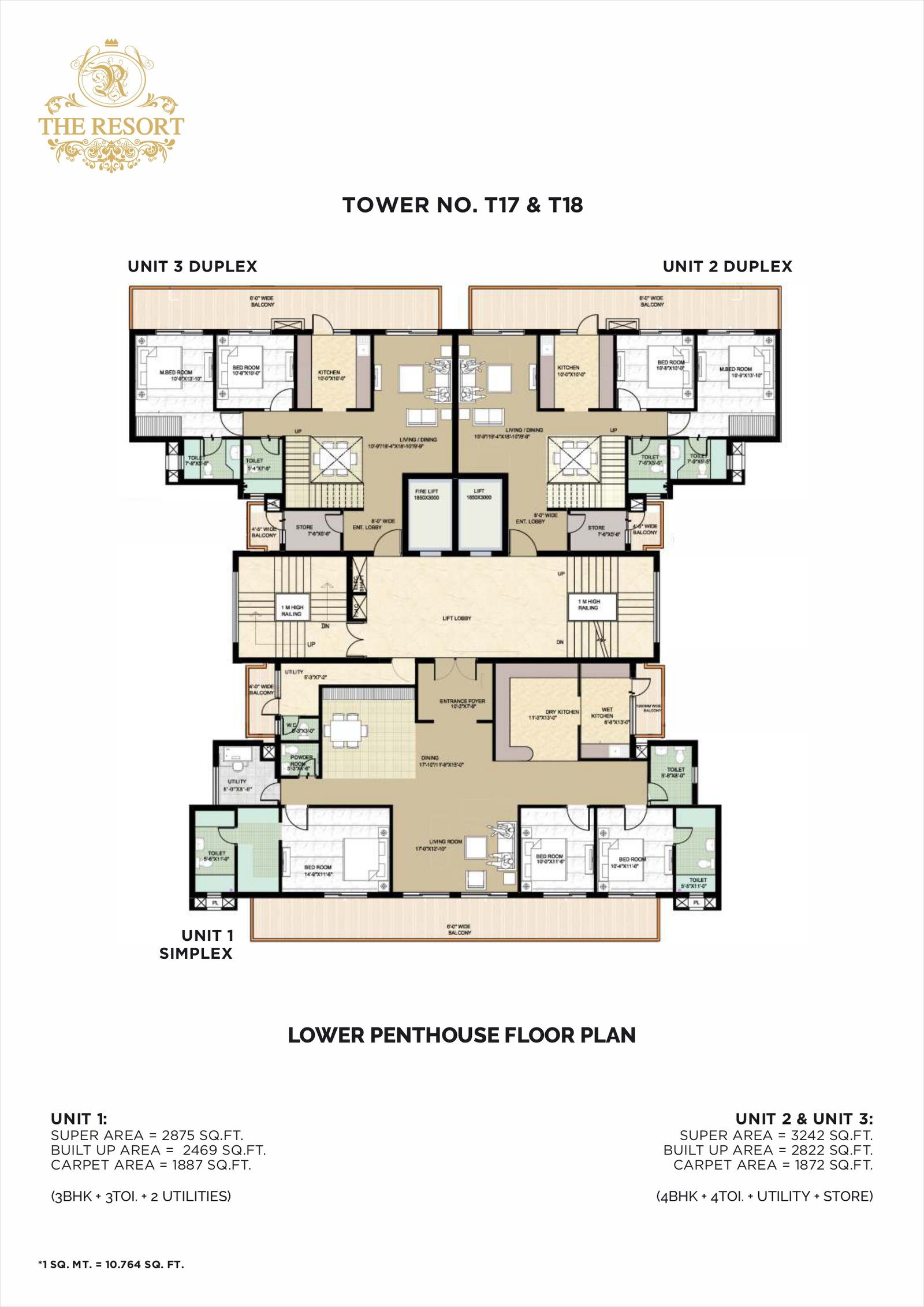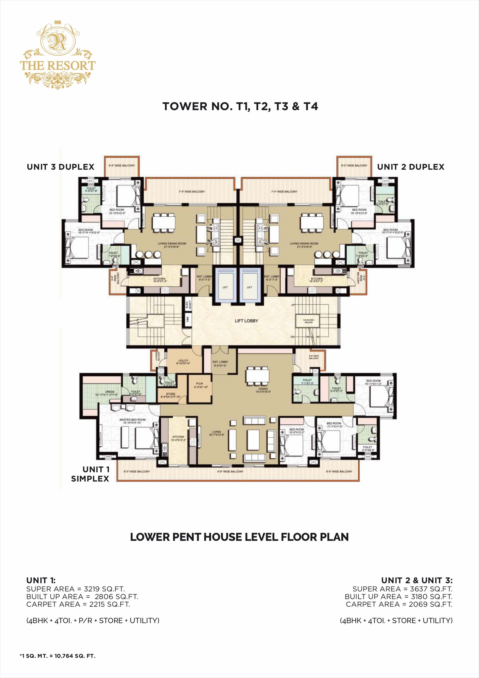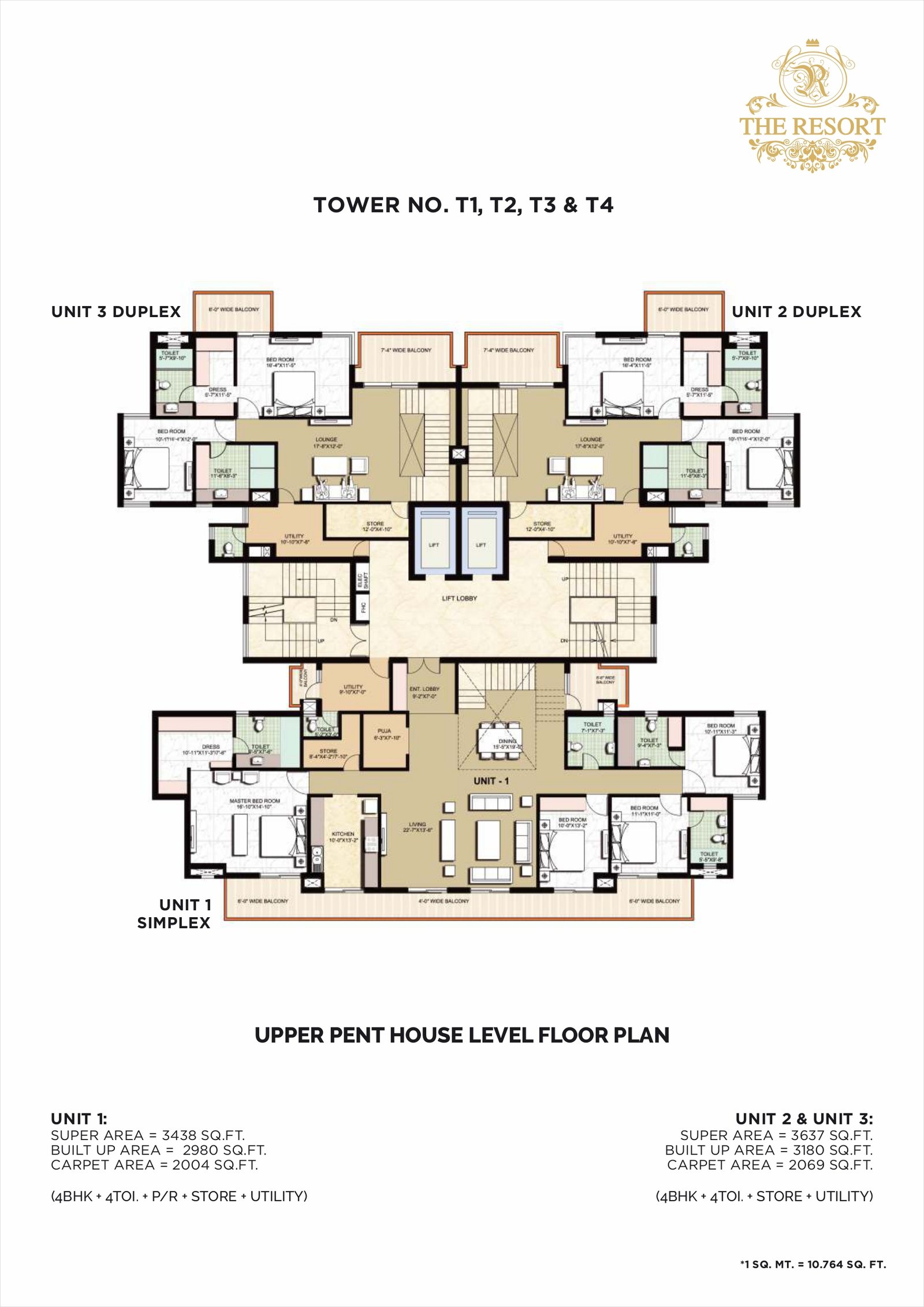 Penthouses / 4 BHKUp to ~ 2875-3637 sq ftLower / Upper penthouses, with multiple bathrooms, store / utility, study & multiple balconies.