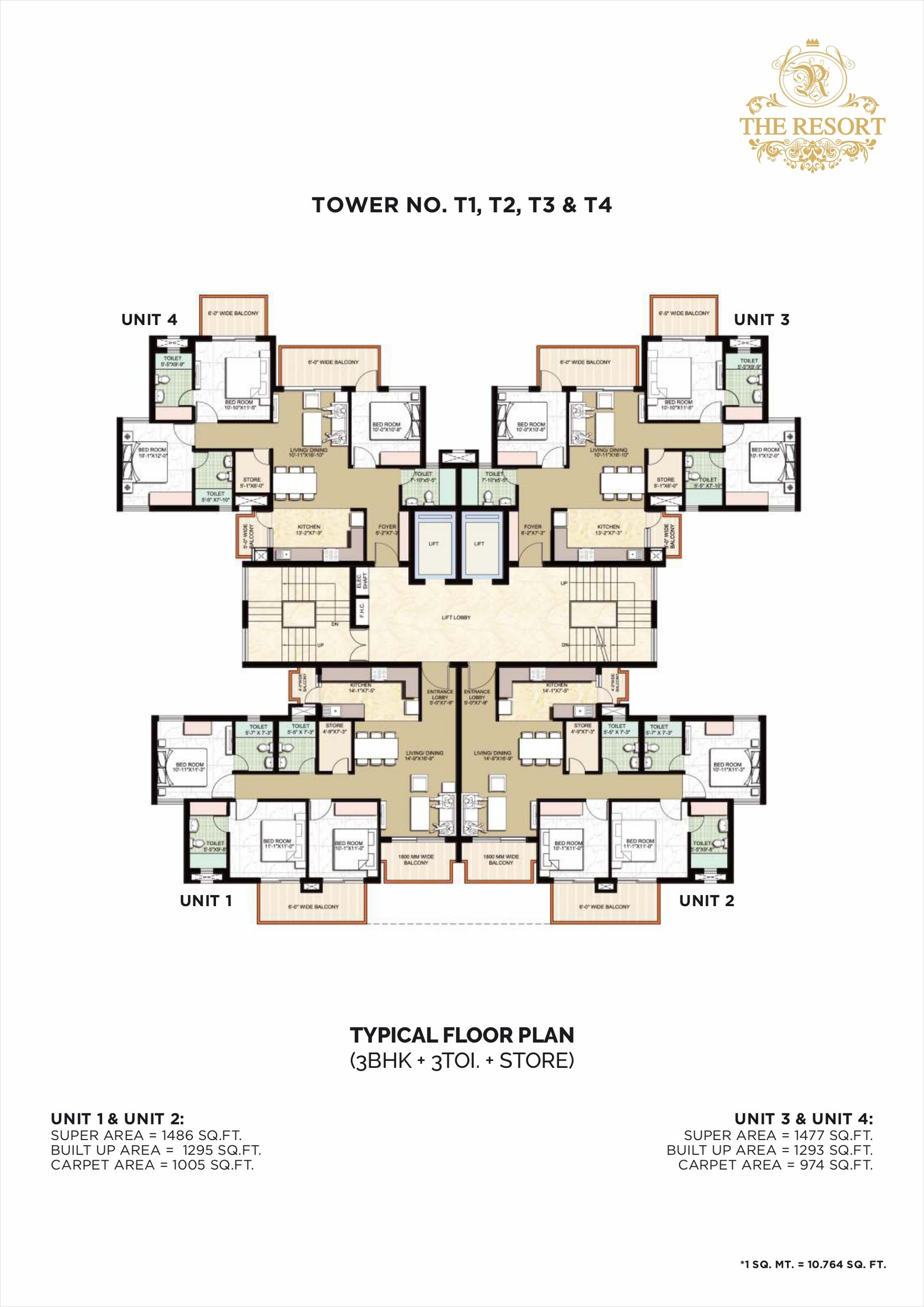 3 BHK + Store~ 1395 – 1486 sq ft3 bedrooms, store room, multiple bathrooms.