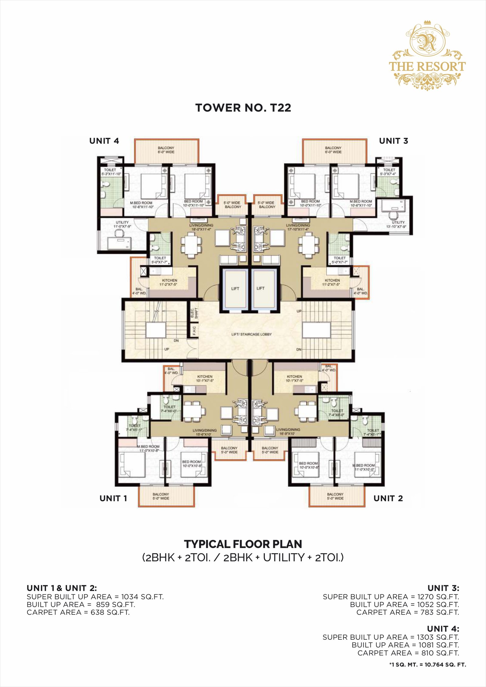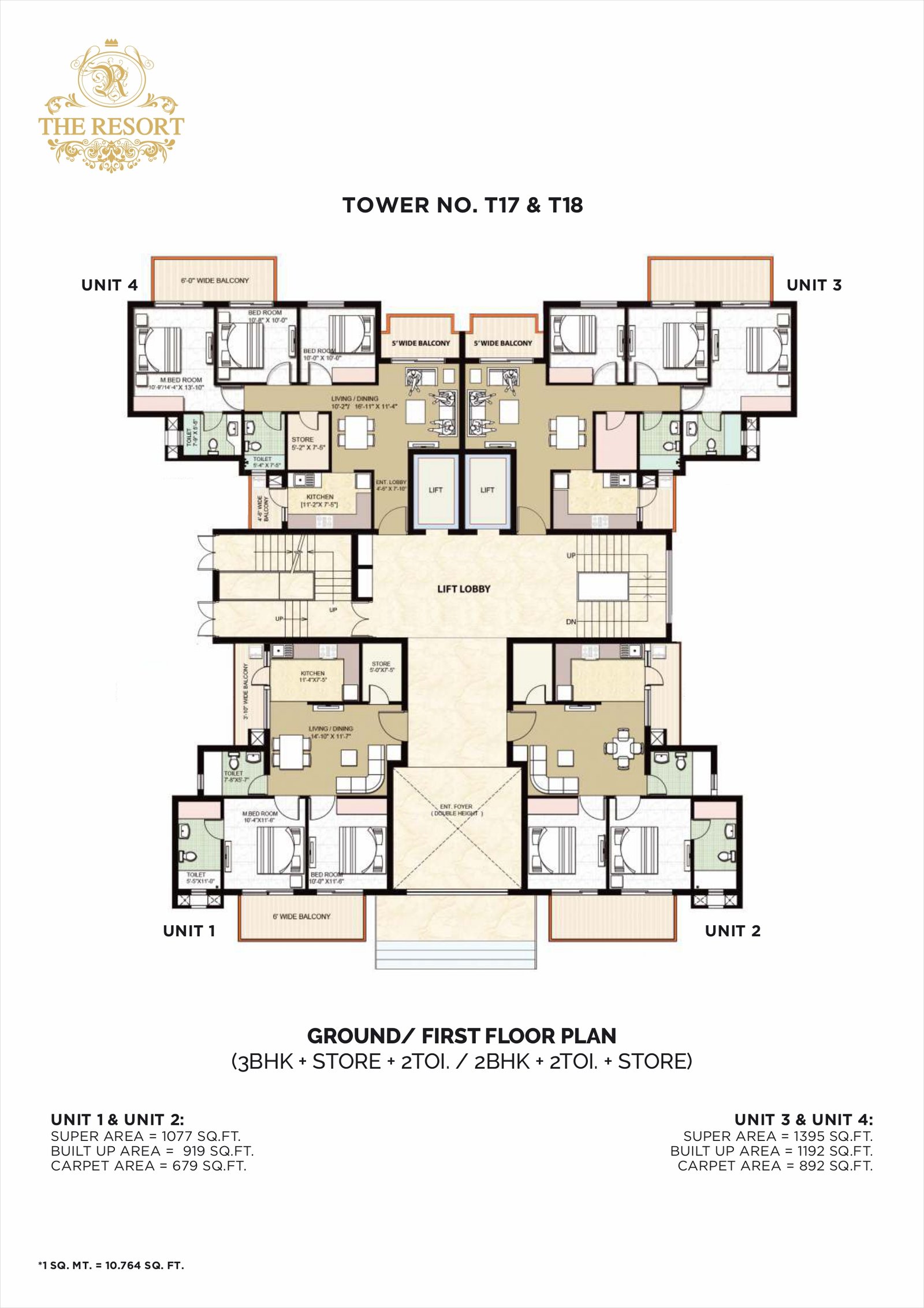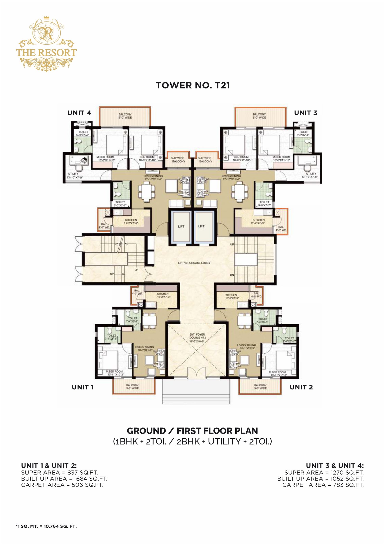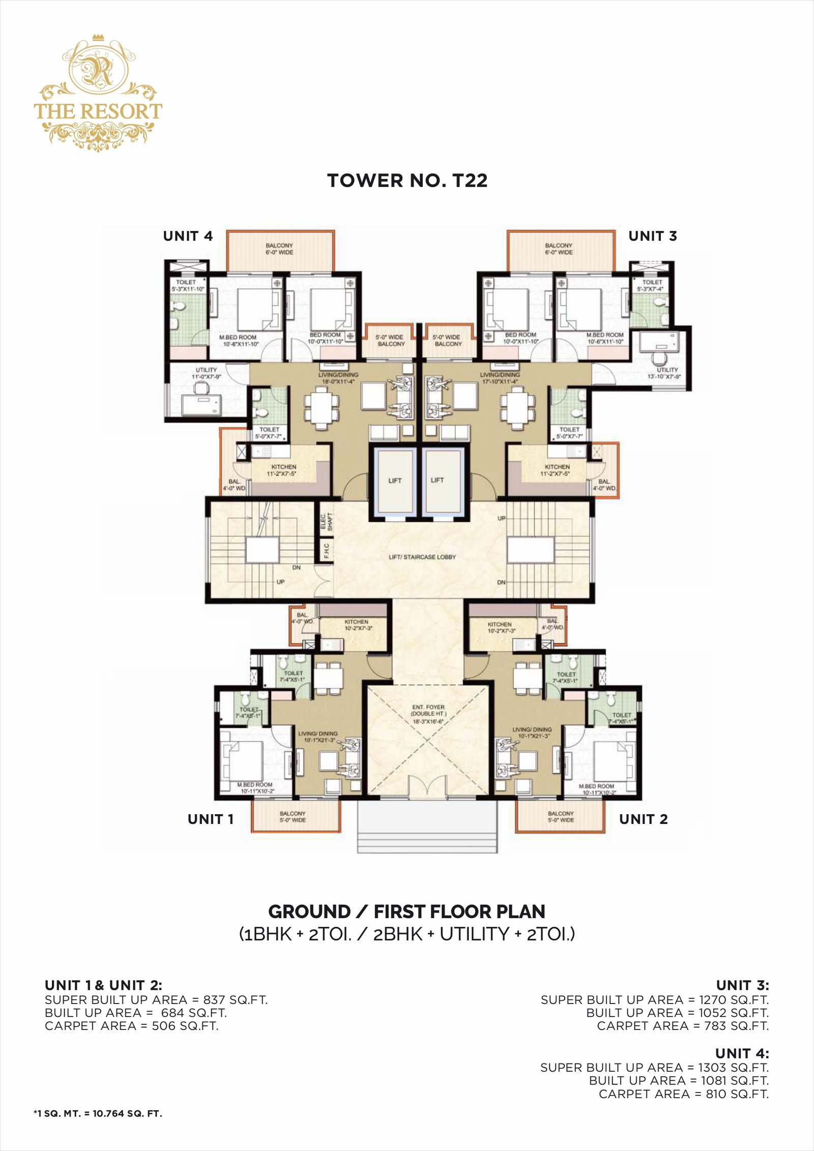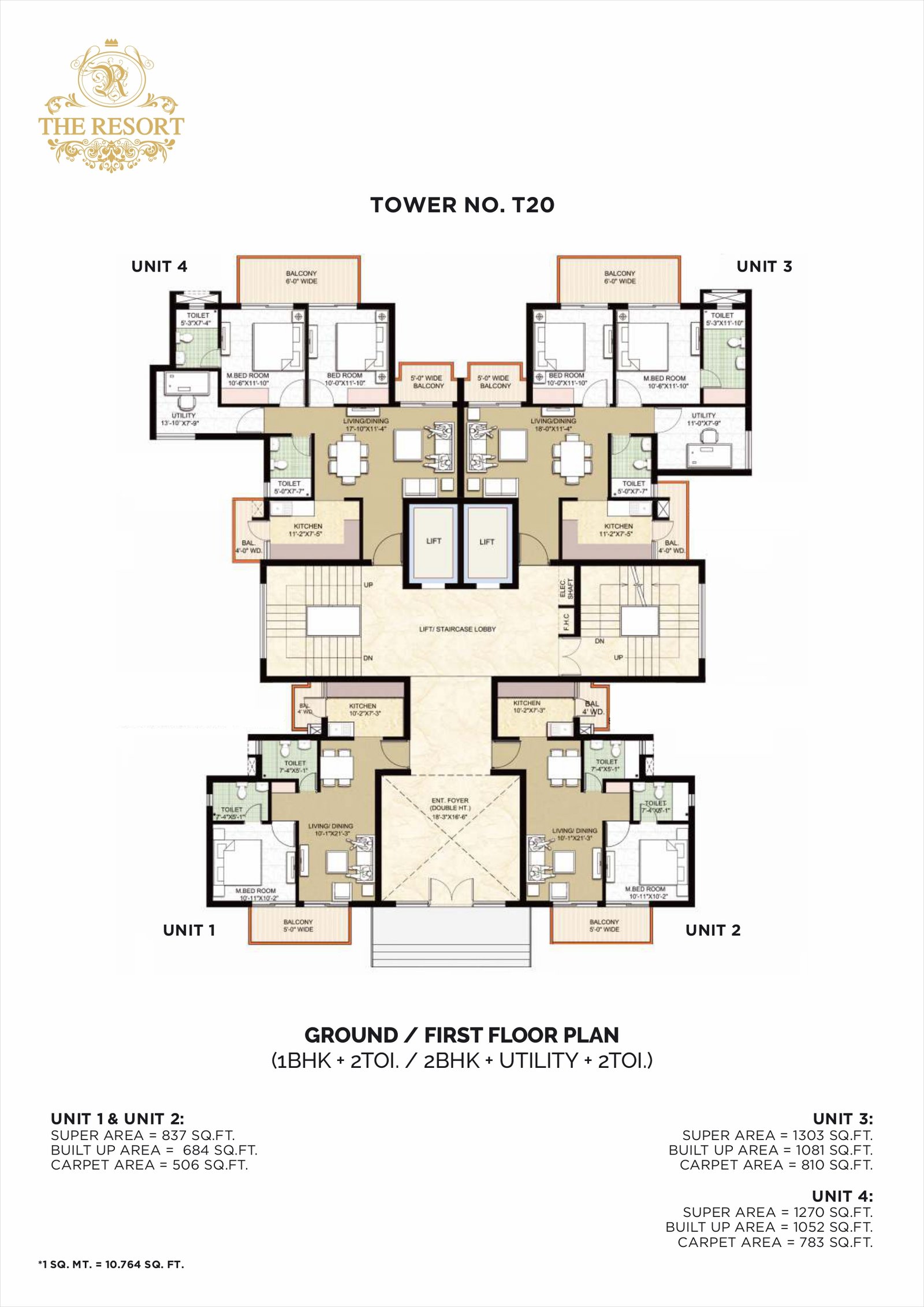 1 BHK ~ 837 – 1303 sq ft Ground & First floor, 1 bedroom, living, kitchen, balconies, 2 toilets in many units.